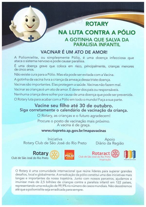 O Rotary Clube de São José do Rio Preto, tendo como foco o combate a pólio, desenvolveu, neste mês de outubro de 2020, projeto que se divide em três vertentes. Na primeira, criação e impressão do folder “Rotary na Luta Contra a Pólio – a gotinha que salva da paralisia infantil” e doações a Pólio Plus. Foram doados US$ 1.218,00, fruto da venda de geleias artesanais, produzidas pela companheira e GA do nosso clube, assim como o depósito, em dinheiro, por outros associados. Na segunda vertente, foi estabelecida parceria com o Diário da Região para divulgação da campanha a favor da vacinação, com encarte de 11.500 (onze mil e quinhentos) folders no jornal impresso, em 15/10 e a publicação do artigo “Falta Pouco”, com importante depoimento pessoal, de companheiro rotariano, em 17/10. E na terceira vertente, houve a parceria com o Rotaract Club Inspiração para a distribuição de 1.000 (mil) folders, uma parte no seu evento “Inspira Dog”, em 17/10 e outra, no centro da cidade no dia 24/10.